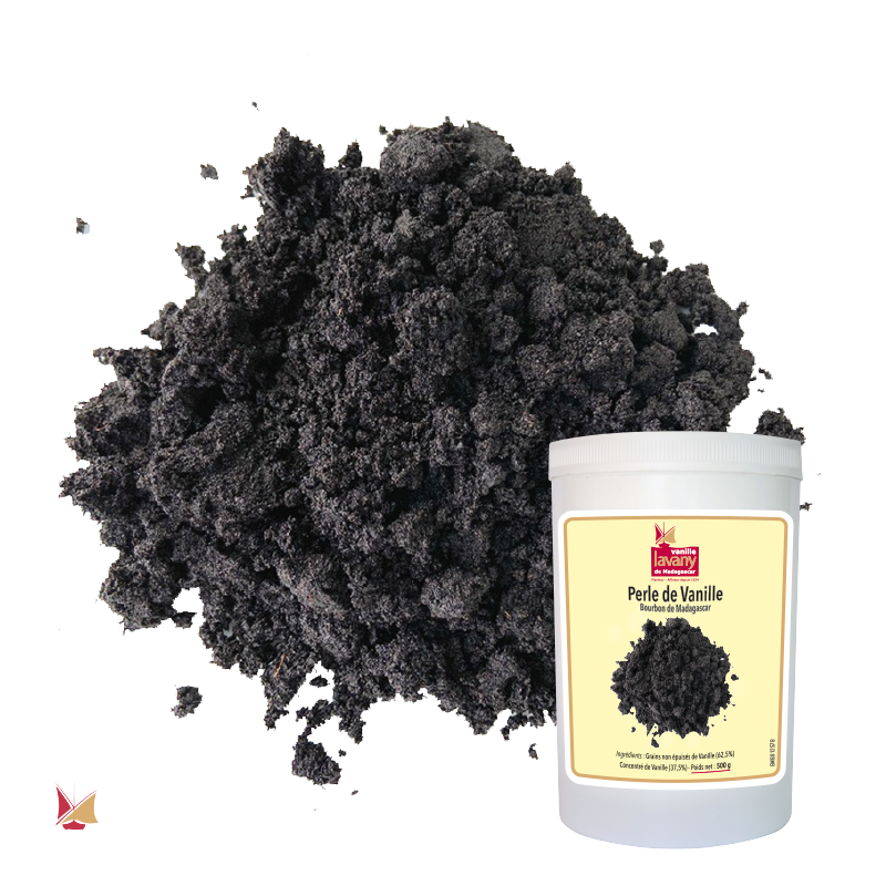 La PERLE de Vanille LAVANY est préparée pour les denrées alimentaires et apporte en plus une forte présence de grains noirs dans les préparations.